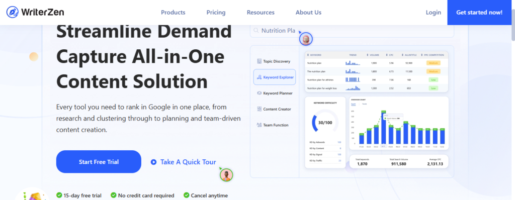 Writing content without a plan wastes money. You might write amazing articles, but nobody sees them if you target the wrong keywords. WriterZen fixes this issue. It uses real data to tell you exactly what your customers search for.