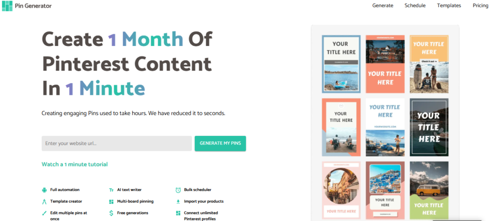 Pin Generator automates this. It takes one URL and turns it into dozens of fresh, clickable pins. It schedules them for you.